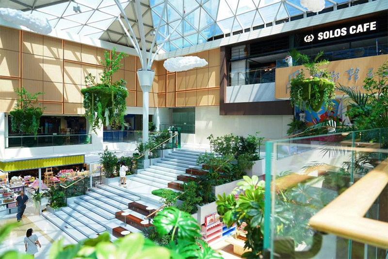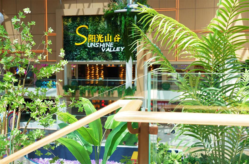 通過填補主中庭和動線調(diào)整等手段,設(shè)計團隊共打造了“云光”“藝境”“SHOW TIME” 、“陽光山谷”四大主題空間,分別對應(yīng)“美妝-云光之下的時尚美學(xué)”“生活-探尋生活中的靈感意境”“潮&趣-年輕力探索中心”“藝術(shù)-綠色有機陽光山谷邂逅藝術(shù)與美食”主力場,增強了品類與空間氛圍的聯(lián)結(jié)性,使一二三期動線順暢連通,有效拉動客流向上走。其中七樓的“陽光山谷”跨層主題空間,將自然生態(tài)的綠植元素和本地的河川山谷地貌滲透其中,把自然河谷的流線設(shè)計與室內(nèi)整體動線的層次結(jié)合,增加了商場的游逛體驗。