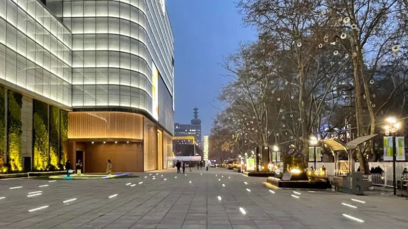 室外兩面的廣場區(qū)域分別被設(shè)計為憩(水秀廣場)、聯(lián)(商業(yè)步行通廊)、迎(慶典廣場)、趣(彈性劇場)、達(地面停車場/生活超市)五大部分,每個部分都將標(biāo)識、景觀鋪裝、綠植、親水景觀、多媒體藝術(shù)裝置等與建筑整體設(shè)計風(fēng)格進行了統(tǒng)一,融合了現(xiàn)代、藝術(shù)、科技與綠色的室外區(qū)域營造出了宜人舒適的氛圍。