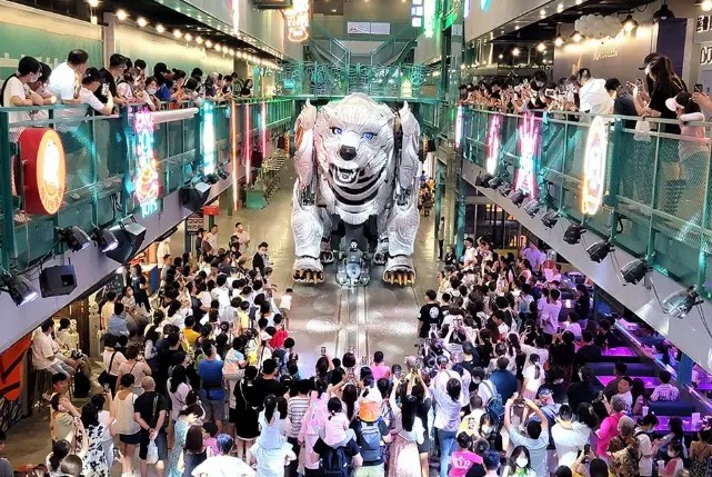 熊洞街以“大空間+小商業(yè)”為特色,匯聚了巨獸巡游、美食、娛樂、藝術(shù)、科技研學(xué)及潮玩等多元化業(yè)態(tài)。其核心IP——巨型機械白熊北北,以其震撼的體型成為街區(qū)焦點,引領(lǐng)游客穿梭于蒸汽朋克的奇妙世界。