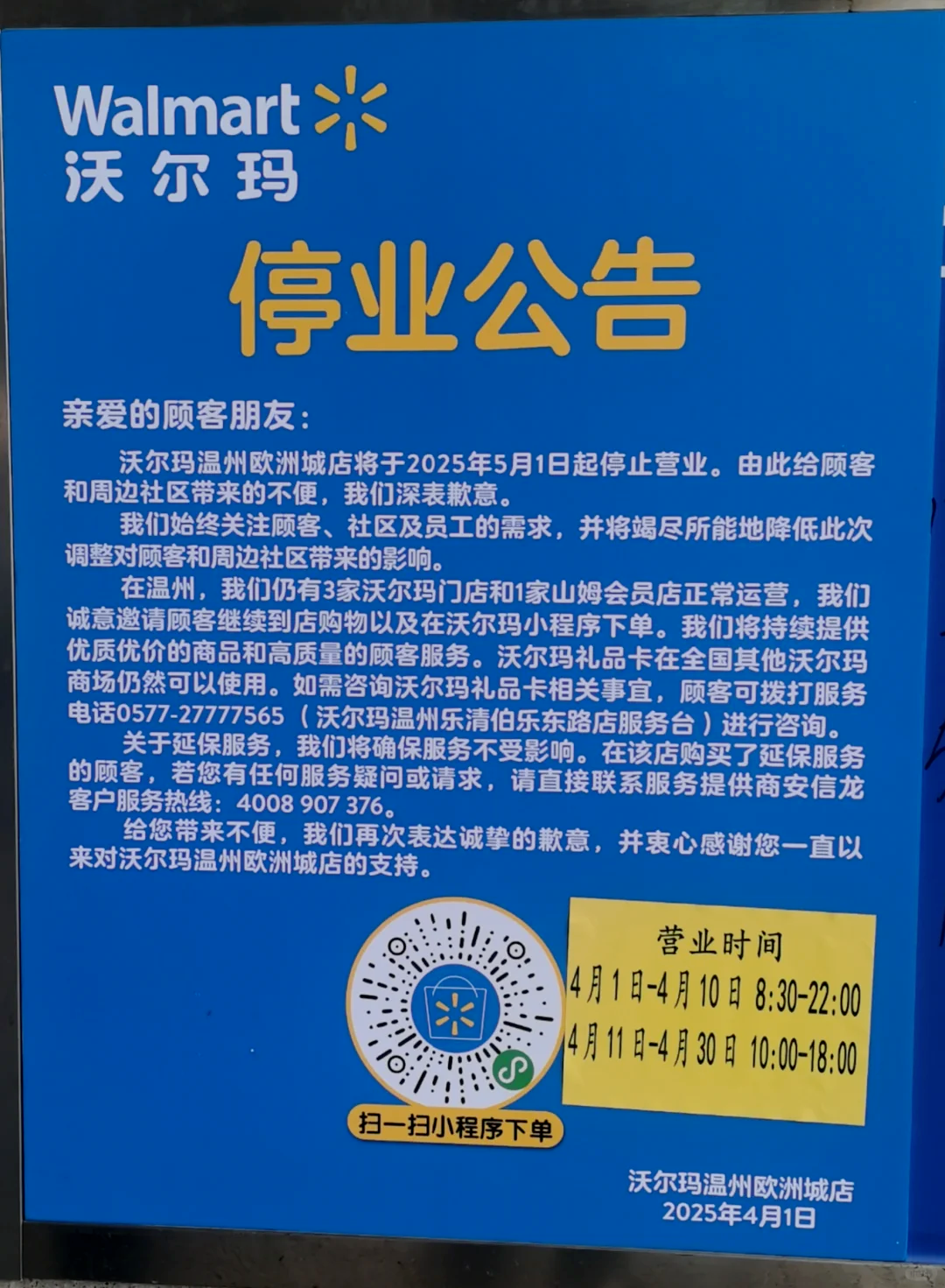 行至2025年,除了如胖東來(lái)、山姆等商超企業(yè),超市行業(yè)的生意依然難做。4月1日,沃爾瑪溫州市區(qū)最后一家門店宣布將于5月1日停業(yè),該店是繼沃爾瑪東海店、沃爾瑪鴻瑛店之后,溫州市區(qū)營(yíng)業(yè)的唯一一家實(shí)體店。在關(guān)閉門店的公告中,沃爾瑪明確表示,關(guān)店原因主要?dú)w結(jié)為戰(zhàn)略調(diào)整以及合同或租約到期。其中廣州新港店,由于所在商城整體改造升級(jí),預(yù)計(jì)今年10月將重新開(kāi)業(yè)。